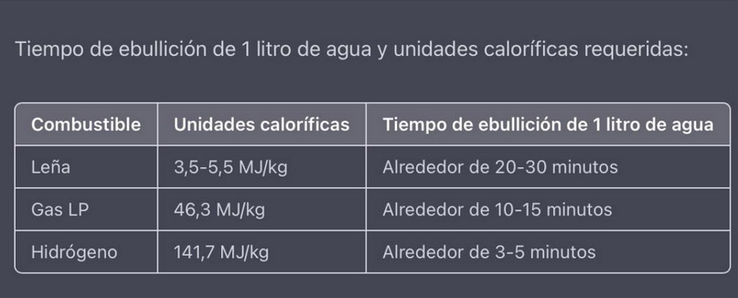 población vulnerable que cocina con leña, más del 60% de la población guatemalteca. En el siguiente cuadro presentó el valor calorífico de la leña, el gas LP y el hidrógeno y el tiempo de ebullición de un litro de agua con estos tres tipos de combustión.